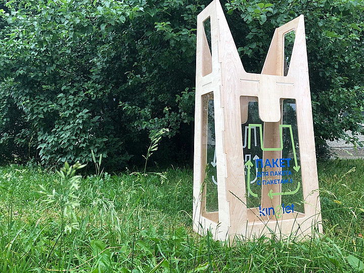 These containers for plastic packaging were installed by the Kinglet company and beckon visitors to hand in unnecessary t-shirt bags, packaging and garbage bags, food wrap, and other similar kinds of package.